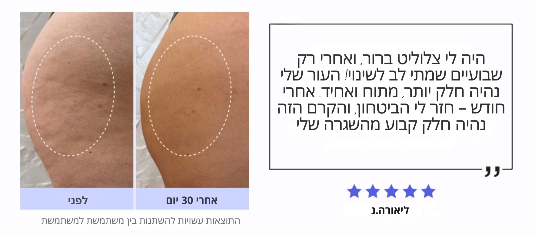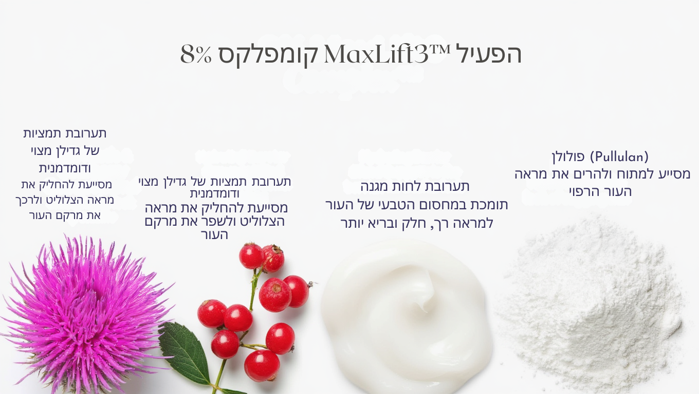 מבוסס על קומפלקס MaxLift3™ הייחודי שלנו, קרם זה שפותח על-ידי רופאי עור מסייע בשיפור משמעותי של מראה עור גבשושי ודק באזור הישבן והירכיים תוך 4–8 שבועות